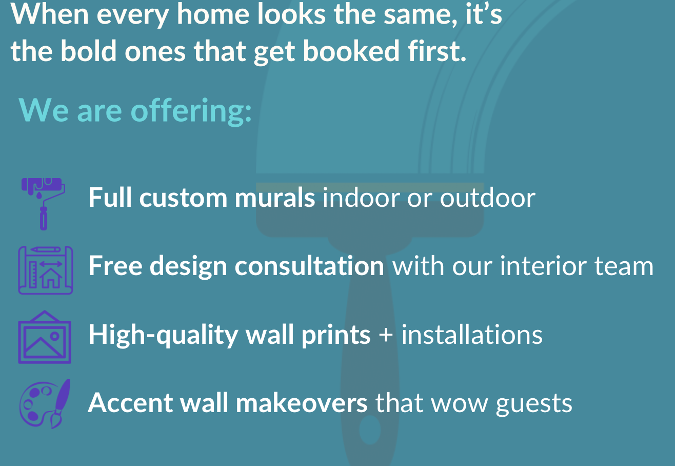 Transform your STR with custom murals, accent walls, and statement pieces that get noticed ~ and booked.
